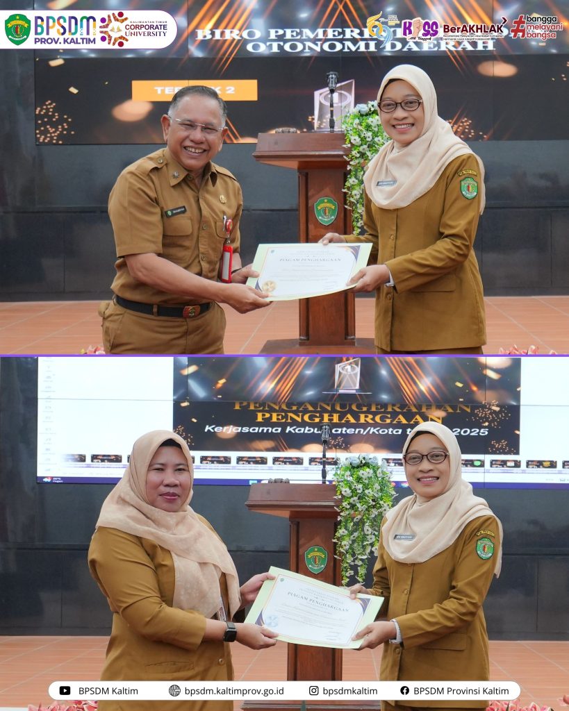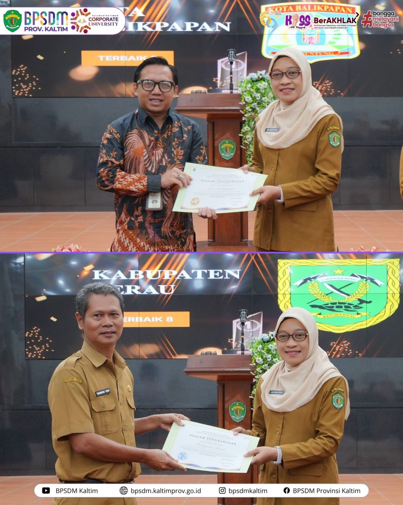 Selain itu, piagam penghargaan juga diberikan kepada 10 Pemerintah Kabupaten/Kota se-Kalimantan Timur atas kerja sama terbaik dalam penyelenggaraan pengembangan kompetensi, sebagai bentuk apresiasi atas sinergi dan kolaborasi yang telah terjalin. Pemerintah kabupaten/kota penerima penghargaan tersebut yaitu Kabupaten Kutai Kartanegara, Kota Balikpapan, Kota Samarinda, Kabupaten Kutai Barat, Kabupaten Paser, Kabupaten Mahakam Ulu, Kota Bontang, Kabupaten Berau, Kabupaten Kutai Timur, dan Kabupaten Penajam Paser Utara.