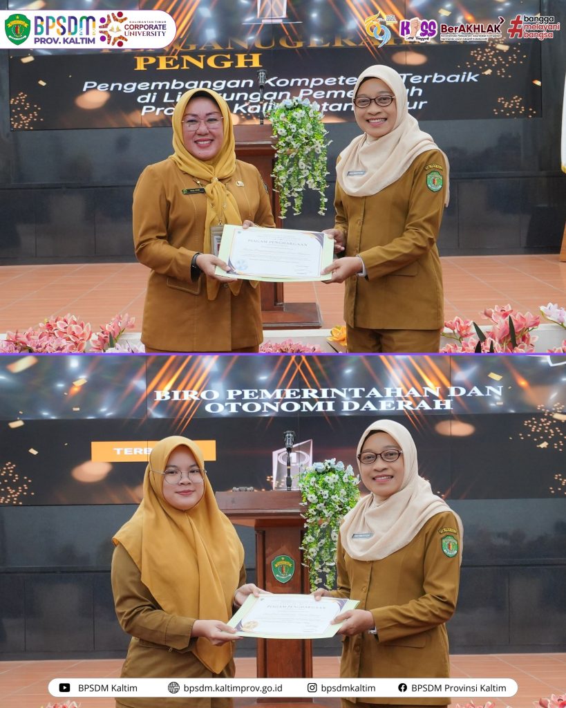 Dalam rangkaian kegiatan tersebut, BPSDM Provinsi Kalimantan Timur menyerahkan Piagam Penghargaan kepada Perangkat Daerah di Lingkungan Pemerintah Provinsi Kalimantan Timur dengan capaian pemenuhan pengembangan kompetensi terbaik. Perangkat daerah penerima penghargaan tersebut meliputi Biro Administrasi Pembangunan, Biro Pemerintahan dan Otonomi Daerah, RSJD Atma Husada Mahakam, Biro Administrasi Pimpinan, Badan Perencanaan Pembangunan Daerah, Biro Pengadaan Barang dan Jasa, Dinas Perpustakaan dan Kearsipan, Dinas Kependudukan dan Pencatatan Sipil, Biro Organisasi, serta Badan Pengembangan Sumber Daya Manusia.