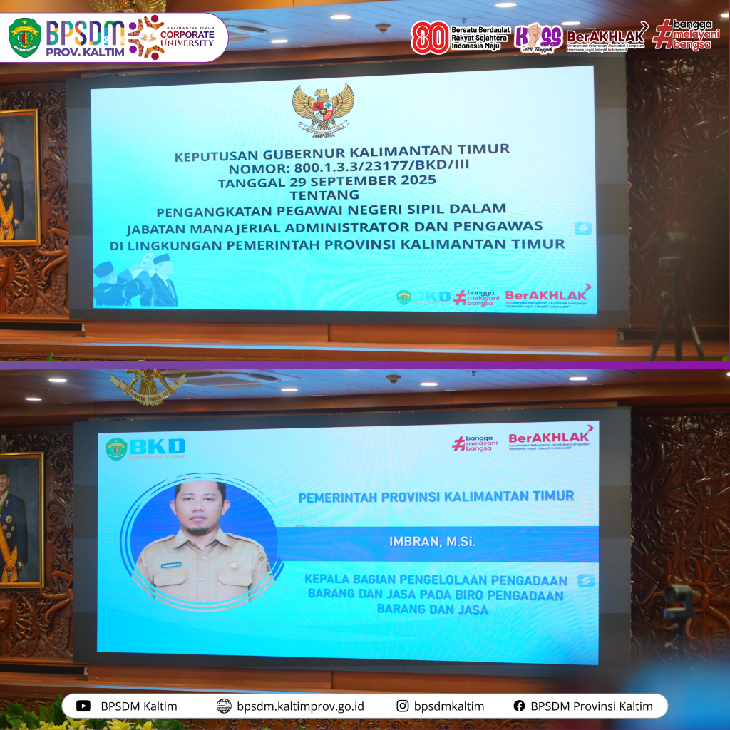 Dalam hal ini salah satu pejabat fungsional, Widyaiswara Ahli Madya BPSDM Kaltim Imbran, M.Si Dilantik menjadi Kepala Bagian Pengelolaan Pengadan Barang dan Jasa Biro PBJ Setda Prov. Kaltim.