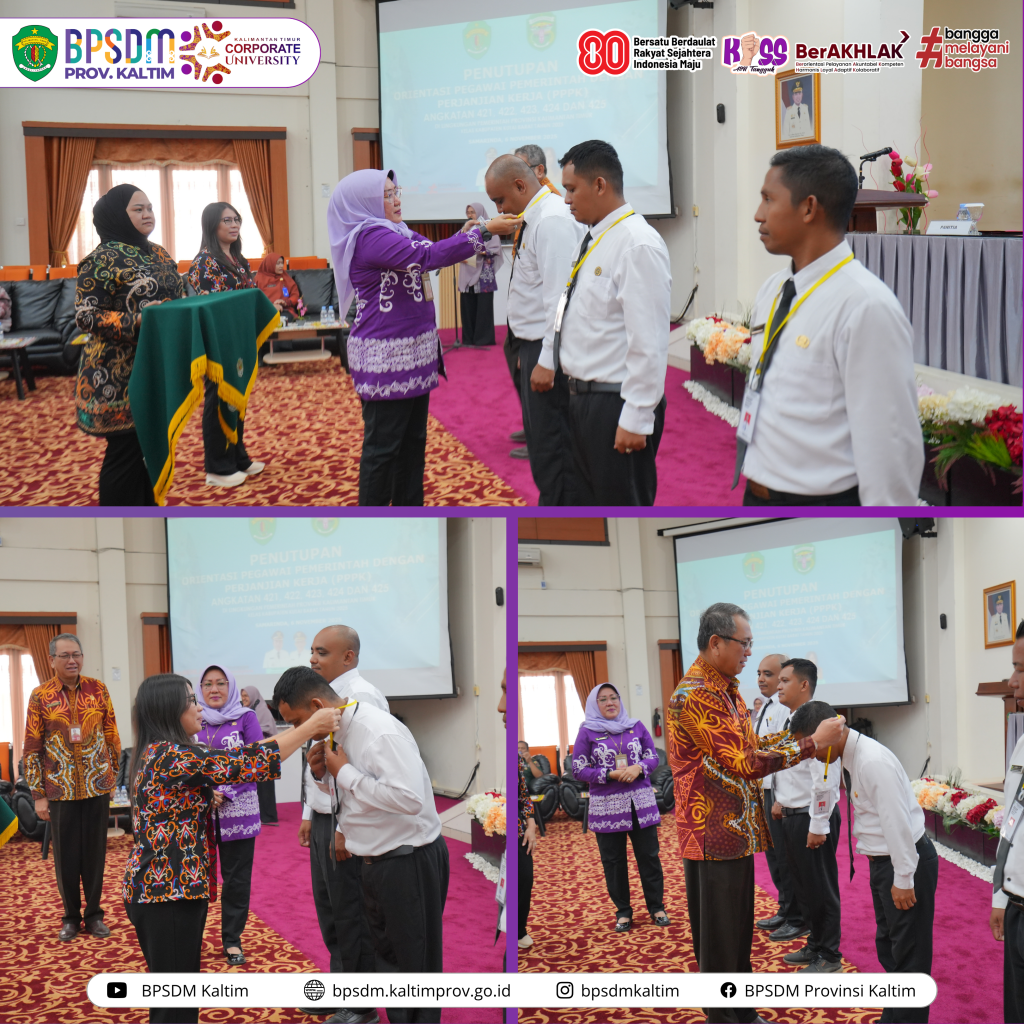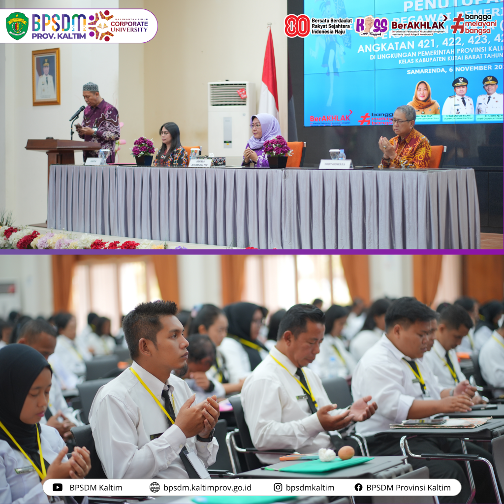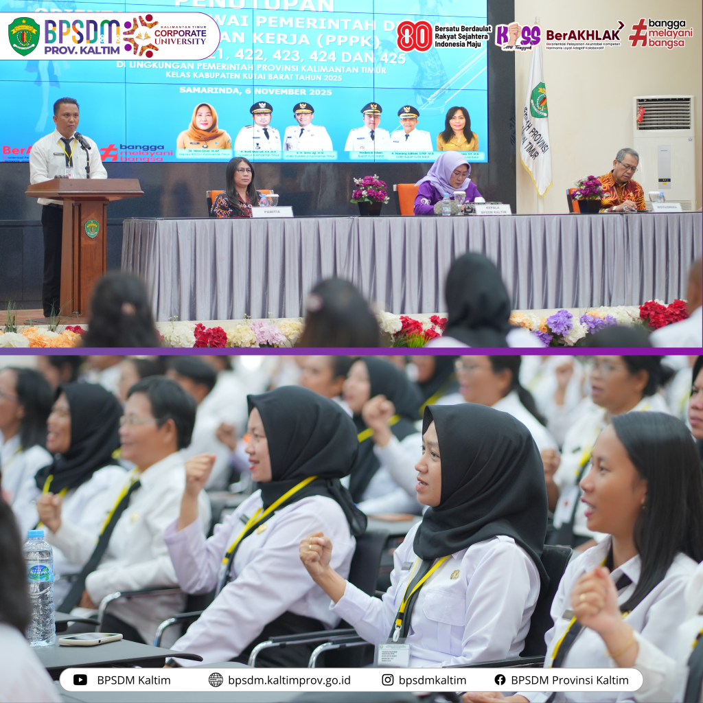 Samarinda-Kepala Badan Pengembangan Sumber Daya Manusia (BPSDM) Provinsi Kalimantan Timur, Dra. Nina Dewi, M.AP, secara resmi menutup kegiatan Orientasi Pegawai Pemerintah dengan Perjanjian Kerja (PPPK) Angkatan 421 hingg 425 Kelas Kabupaten Kutai Barat Tahun 2025. Acara berlangsung di Aula Utama BPSDM Provinsi Kaltim, Samarinda, pada Kamis (6/11/25).