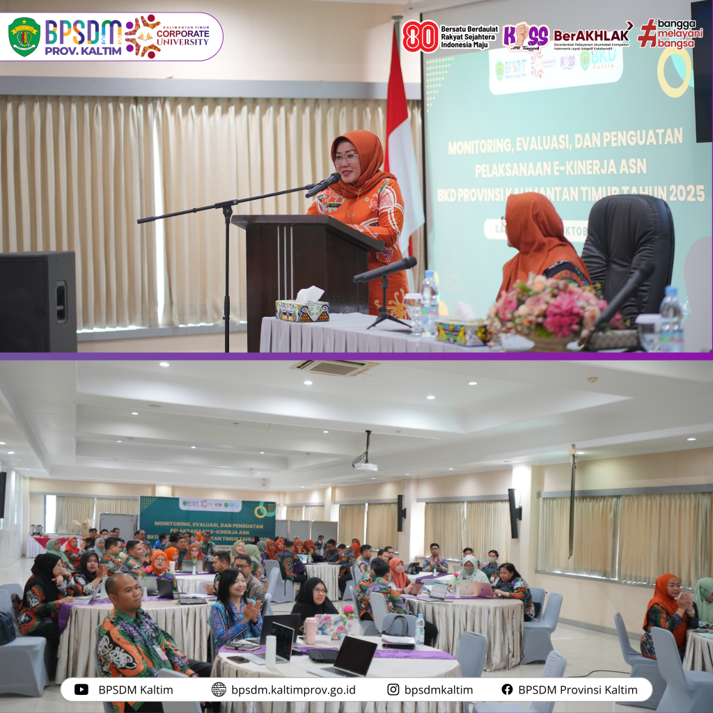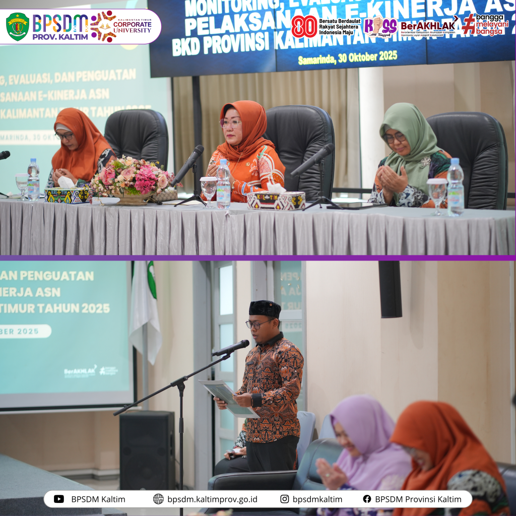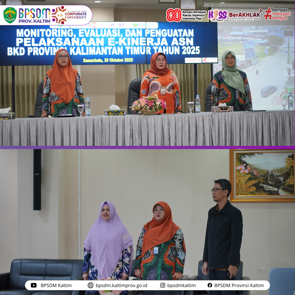 Samarinda-Dalam rangka memperkuat tata kelola pemerintahan berbasis kinerja, Badan Kepegawaian Daerah (BKD) Provinsi Kalimantan Timur berkerjasama Badan Pengembangan Sumber Daya Manusia (BPSDM) Provinsi Kalimantan Timur menyelenggarakan kegiatan Monitoring, Evaluasi, dan Penguatan Pelaksanaan e-Kinerja ASN BKD Provinsi Kalimantan Timur Tahun 2025 di Ruang Rapat II Lantai 3 BKD Kaltim. Kamis (30/10/25)