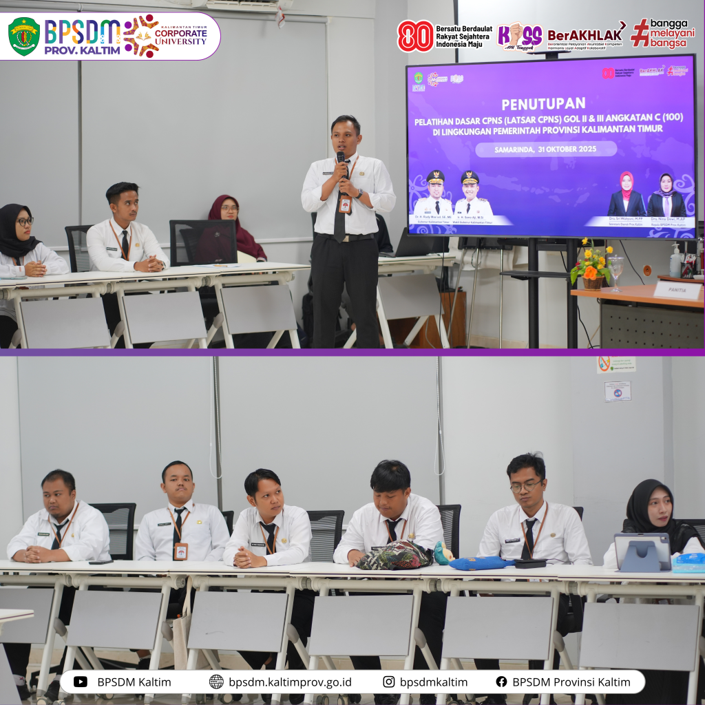 Samarinda-Badan Pengembangan Sumber Daya Manusia (BPSDM) Provinsi Kalimantan Timur resmi menutup Pelatihan Dasar (Latsar) CPNS Golongan II dan III Angkatan 100 di lingkungan Pemerintah Provinsi Kalimantan Timur. Jumat (31/10/25)