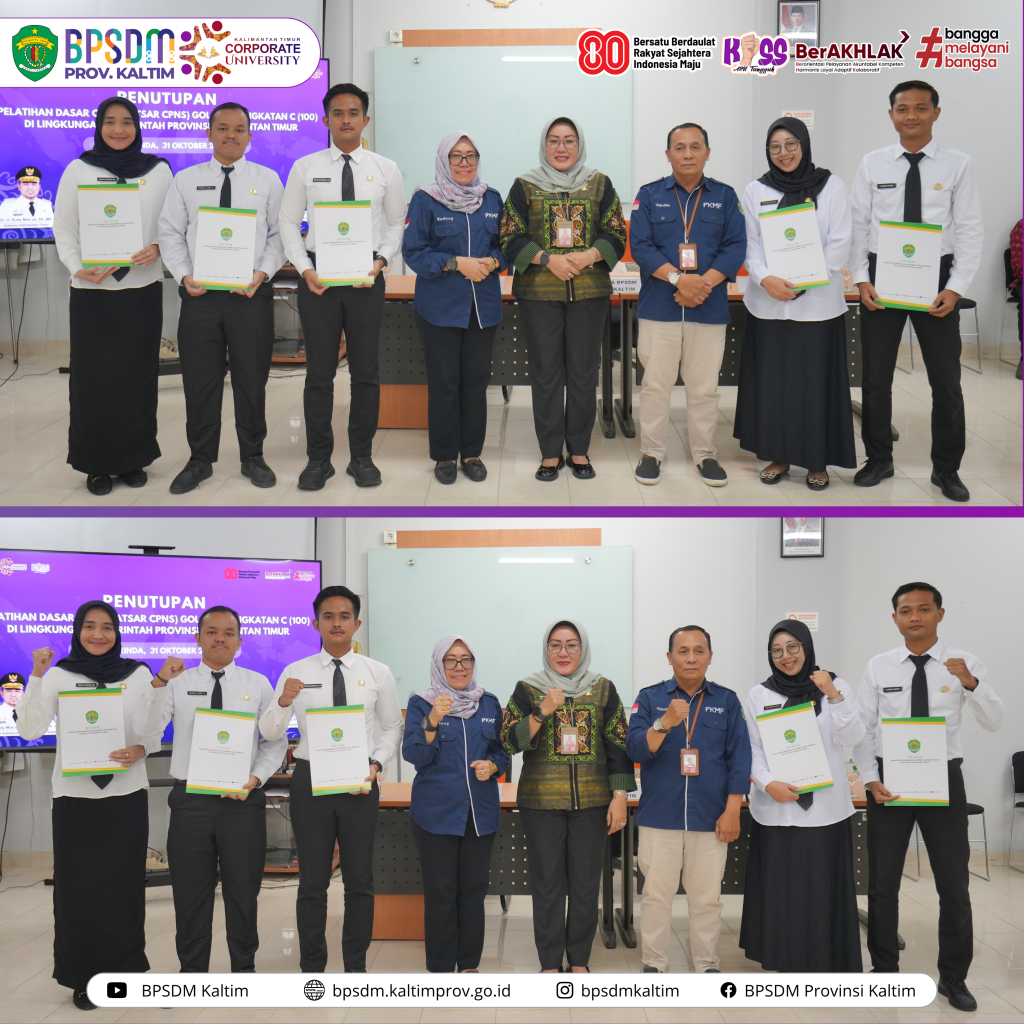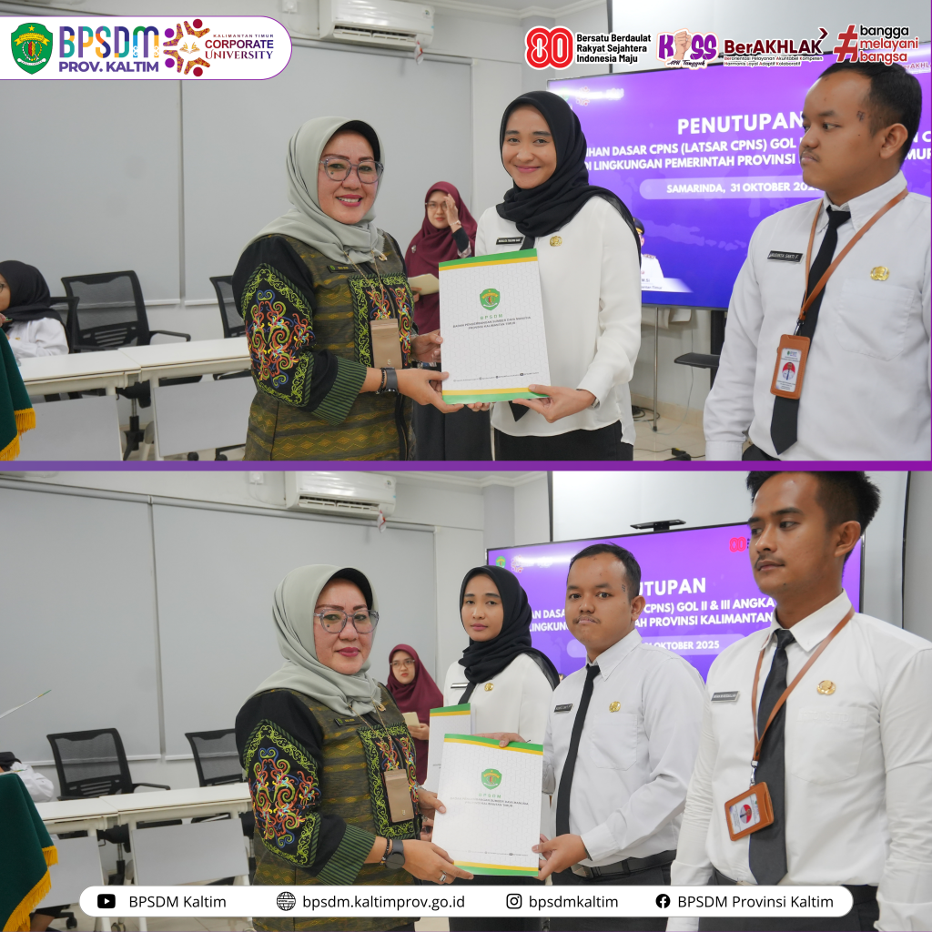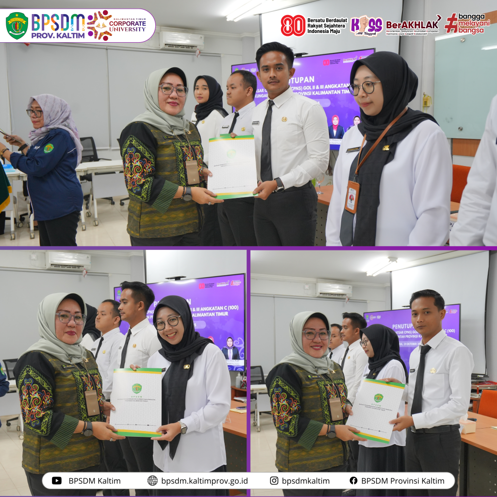 Menutup kegiatan, Kepala BPSDM Kaltim menyampaikan rasa bangga atas keberhasilan seluruh peserta dan berharap ilmu yang diperoleh dapat diimplementasikan dalam tugas pelayanan publik.
