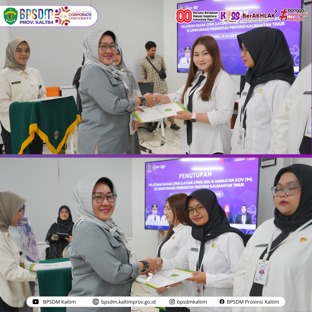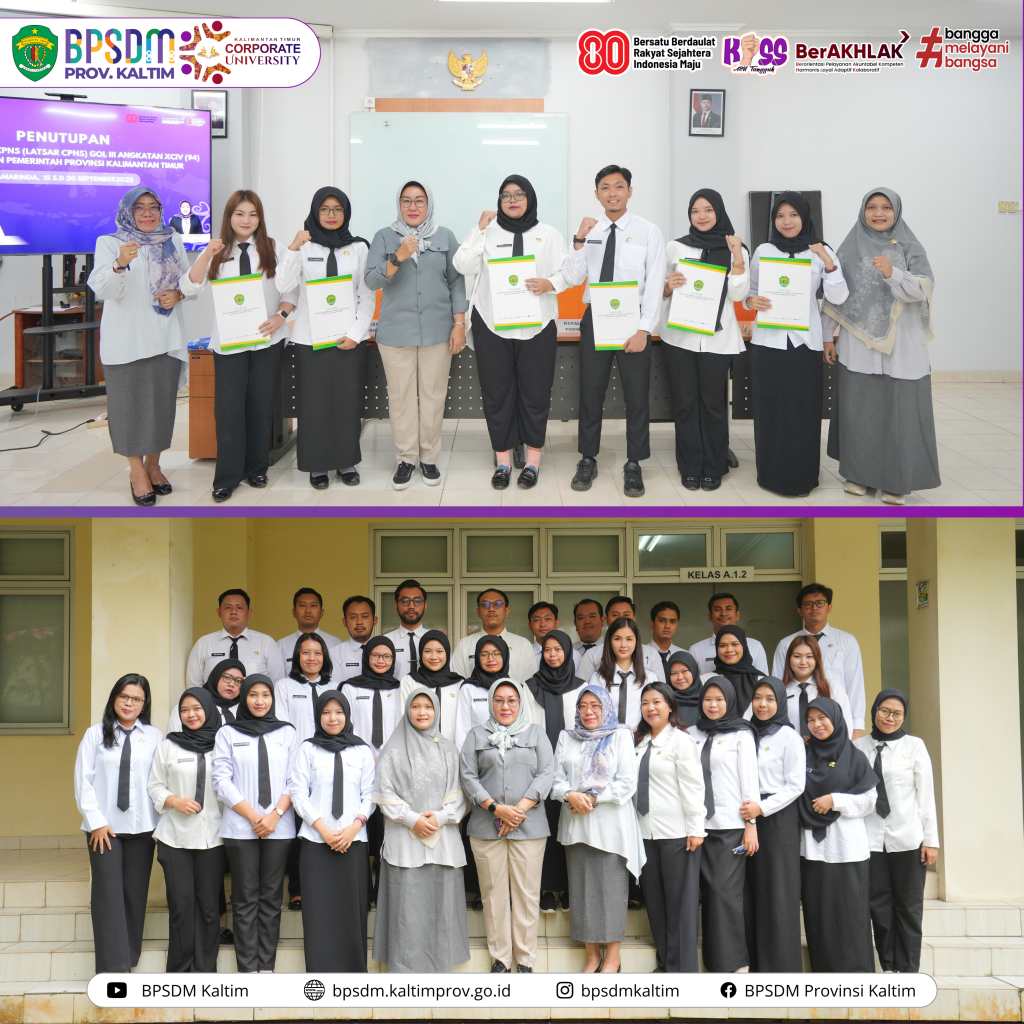 Samarinda-Pelatihan Dasar (latsar) Calon Pegawai Negeri Sipil (CPNS) Golongan III Angkatan XCIV (94) Lingkup Pemerintah Provinsi Kalimantan Timur resmi ditutup oleh Kepala Badan Pengembangan Sumber Daya Manusia (BPSDM) Provinsi Kalimantan Timur. Sabtu (20/09/25)