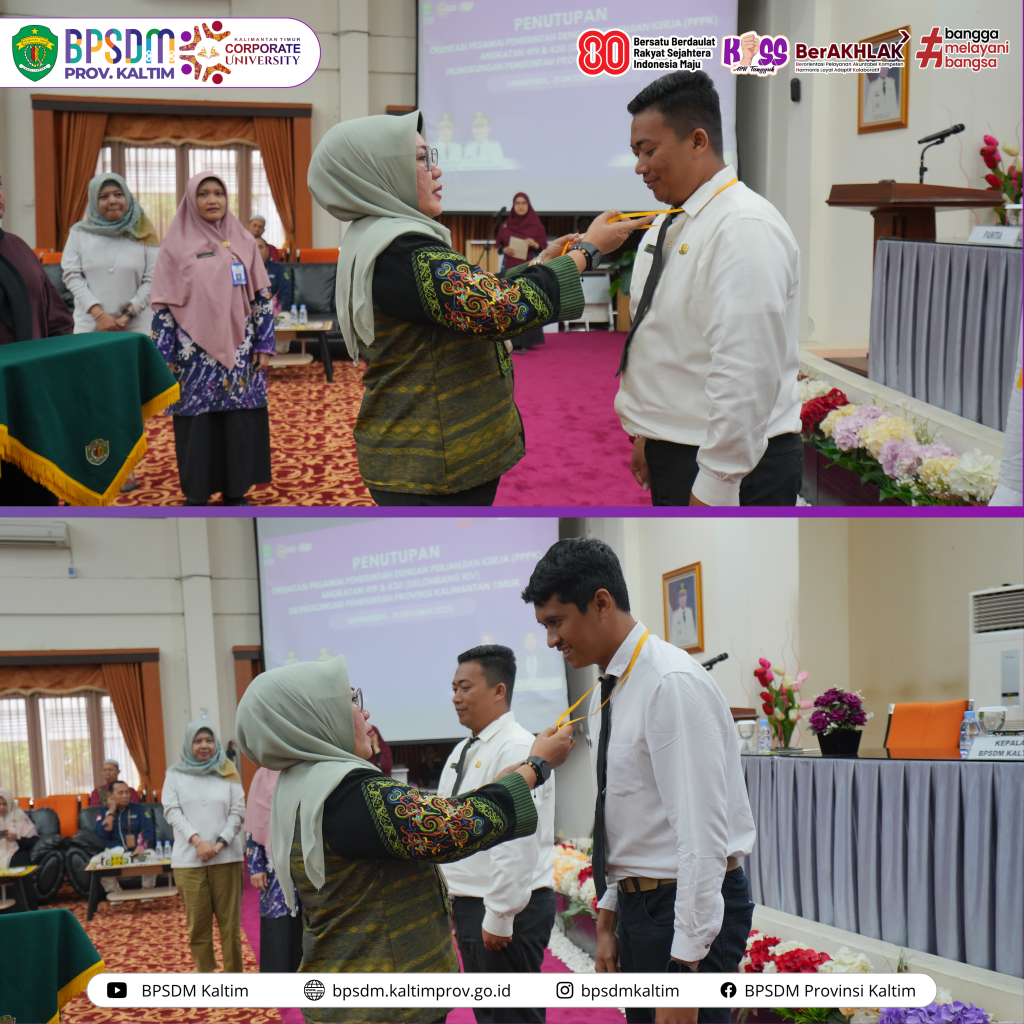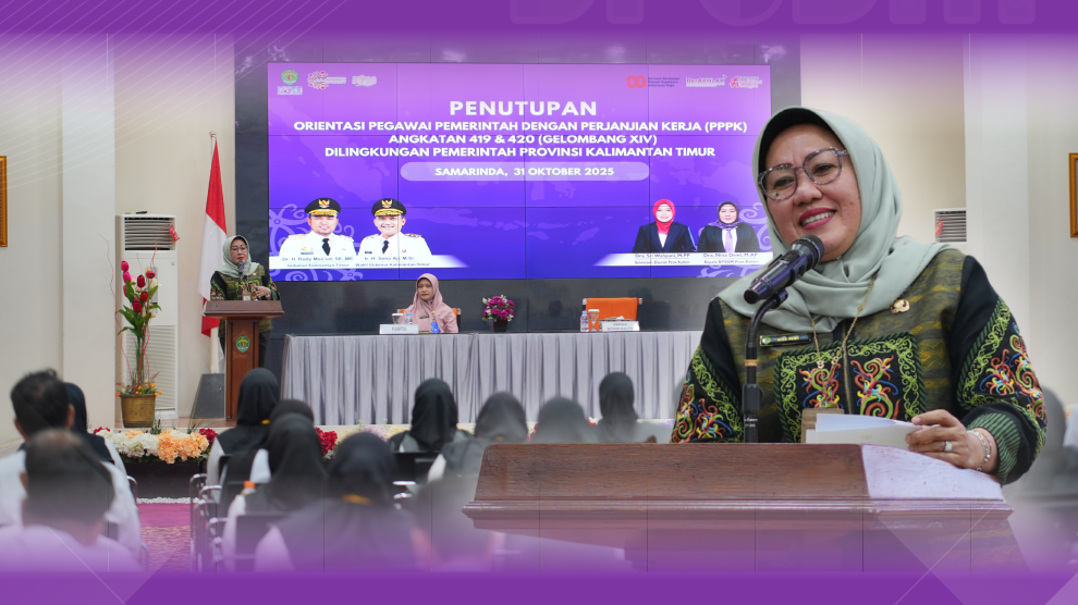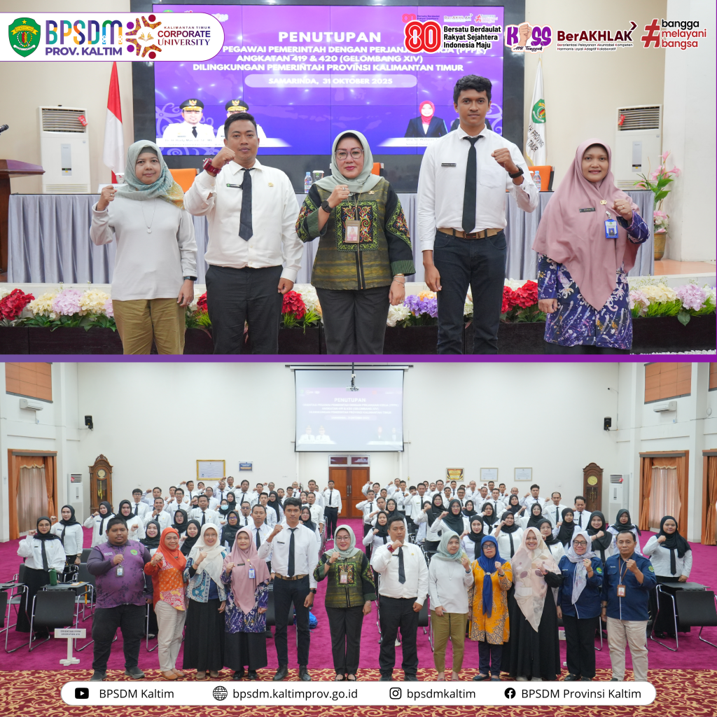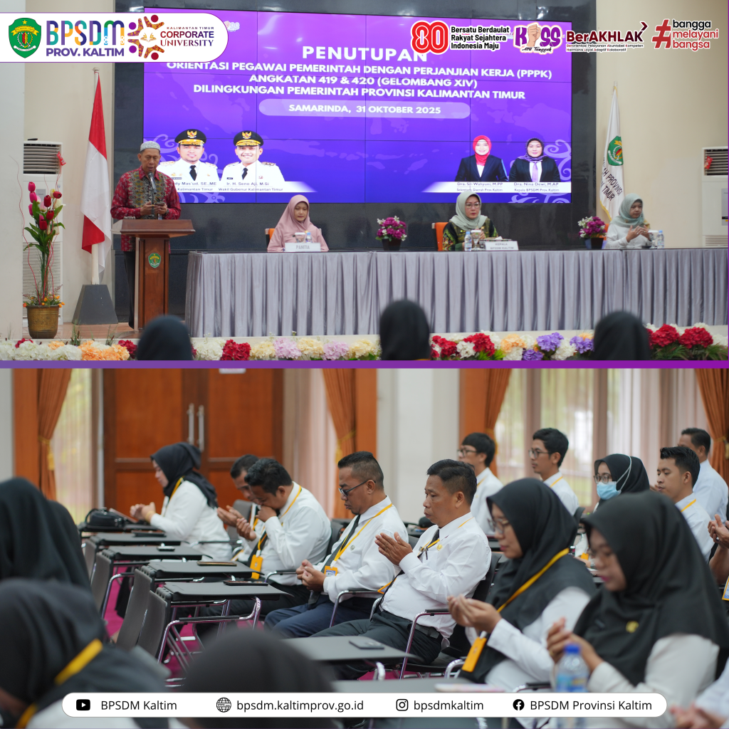 Samarinda-Dra Nina Dewi M.AP selaku Kepala Badan Pengembangan Sumber Daya Manusia (BPSDM) Provinsi Kalimantan Timur resmi menutup kegiatan Orientasi Pegawai Pemerintah dengan Perjanjian Kerja (PPPK) Gelombang XIV Angkatan 419 dan 420. Jum’at (31/10/25)