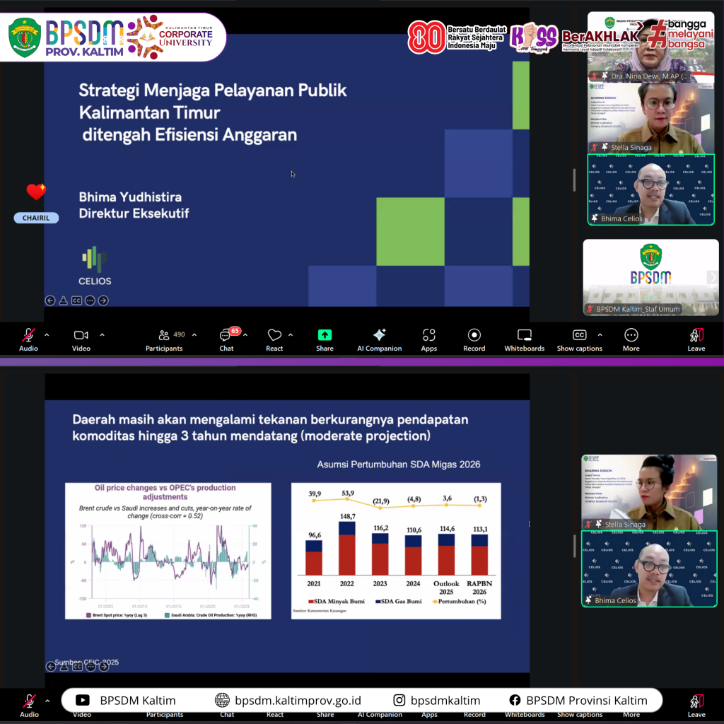 Samarinda-BPSDM Provinsi Kalimantan Timur kembali menggelar Sharing Session edisi ke-99, Selasa (25/11/2025), menghadirkan ekonom nasional Bhima Yudhistira sebagai narasumber. Kegiatan ini berlangsung sebagai ruang pembelajaran strategis bagi ASN di tengah tantangan fiskal nasional yang diprediksi semakin ketat pada tahun 2026.