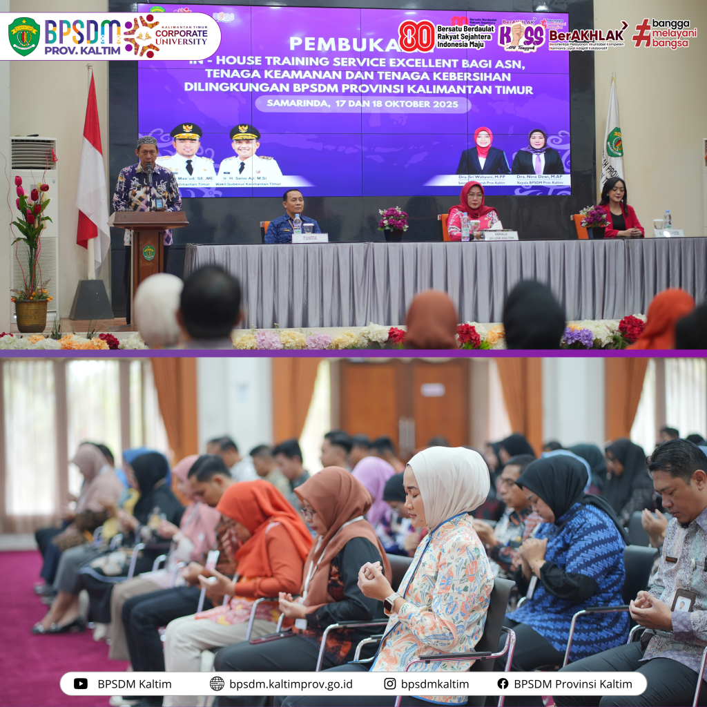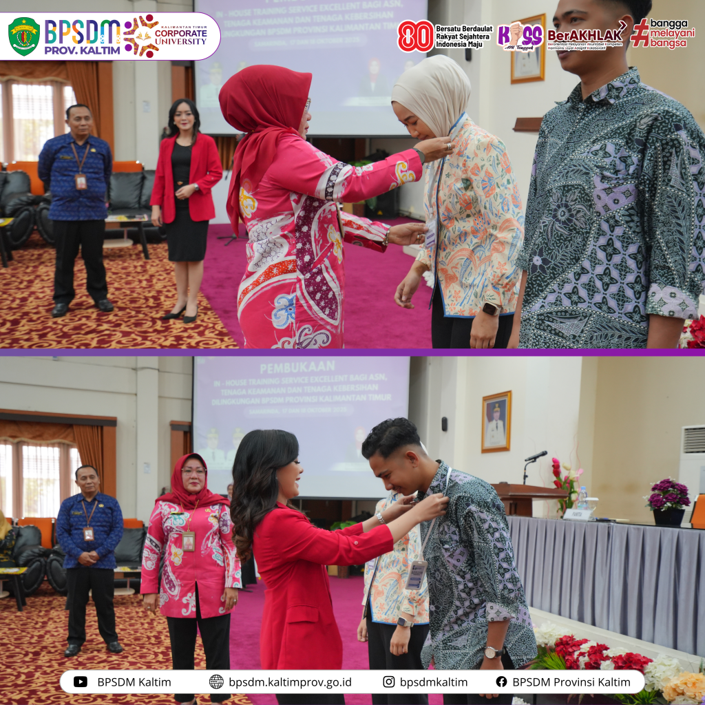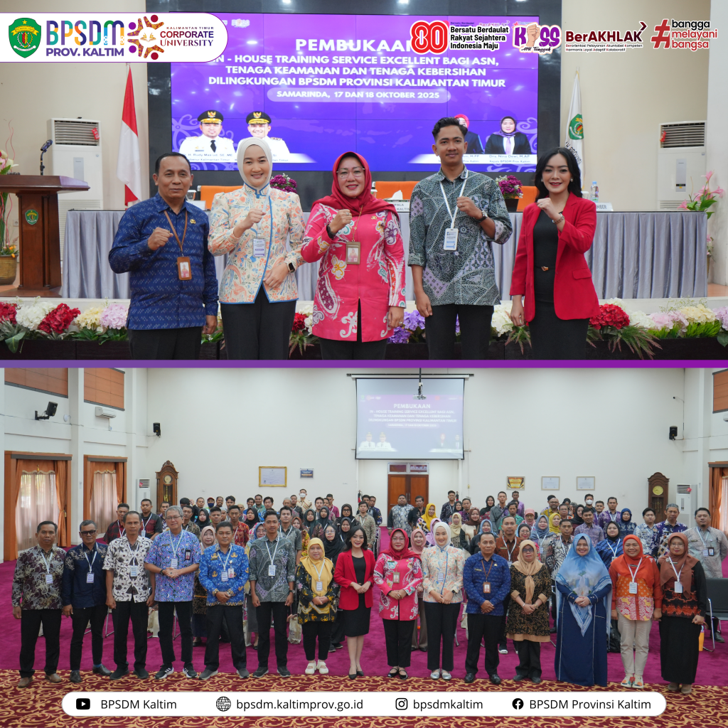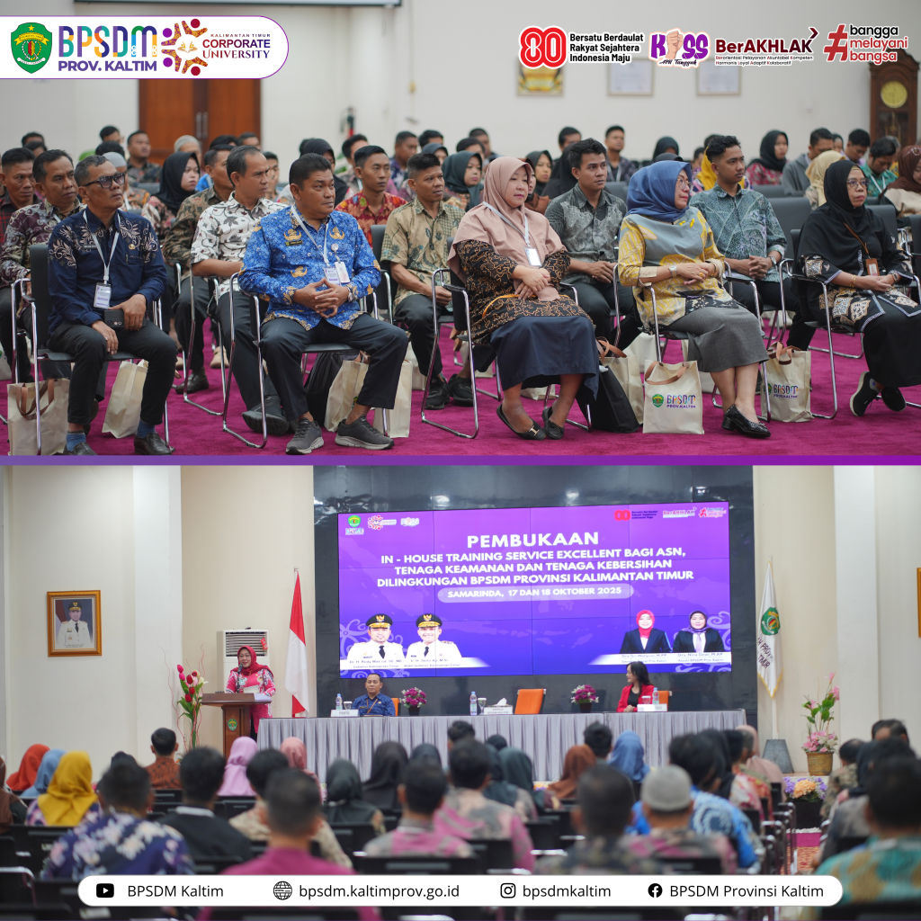 Samarinda-Untuk memberikan pemahaman, pembekalan, serta keterampilan dasar dalam hal pelayanan prima kepada seluruh unsur pelaksana tugas sebagai pelayan publik, Badan pengembanagn Sumber Daya Manusia Provinsi Kalimantan Timur menggelar In House Training Service Excellent bagi Aparatur Sipil Negara, Tenaga Keamanan serta Tenaga Kebersihan yang terselenggara di Aula “Bagimu Negeri Jiwa Raga Kami” BPSDM Kaltim CorpU. Jum’at (17/09/25).