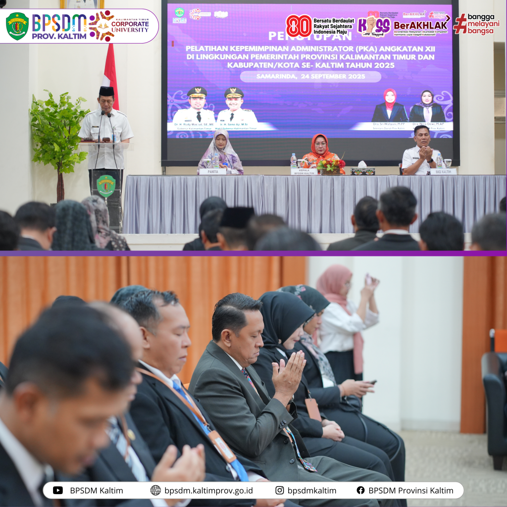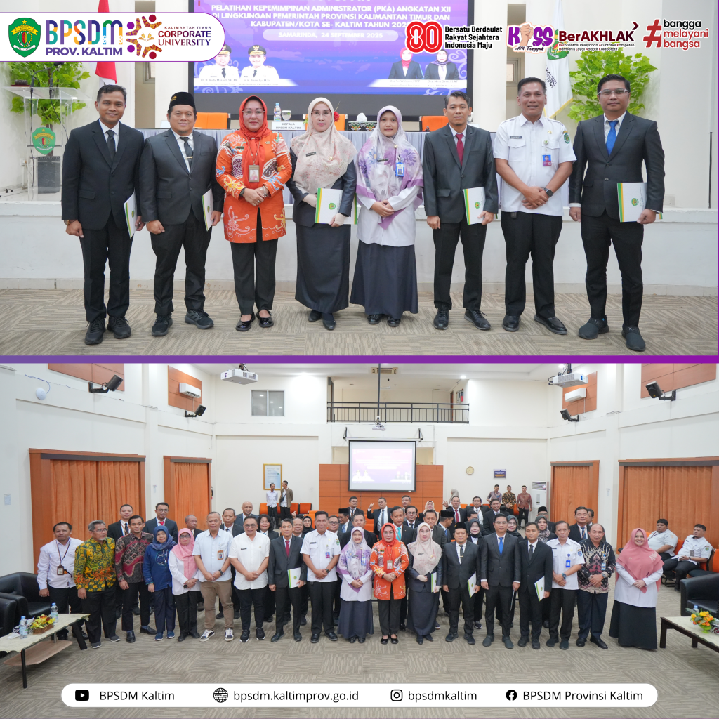 Samarinda – Sebanyak 40 orang peserta Pelatihan Kepemimpinan Administrator (PKA) yang tergabung dalam Angkatan XII, hari ini (24/9) mengakhiri kegiatan pelatihan. Peserta pelatihan selain berasal dari para pejabat eselon III atau pejabat administrator dari lingkup Pemerintah Provinsi Kaltim, juga berasal dari Pemerintah Kabupaten/Kota se Kaltim. Pelatihan selama 105 hari atau tiga setengah bulan dilakukan secara blanded learning (sistem pembelajaran campuran), yaitu secara daring (dalam jaringan) atau online dan secara klasikal (tatap muka atau luring/luar jaringan atau offline). Ada yang dilakukan secara mandiri, jadi peserta bisa belajar secara mandiri melalui modul yang disediakan oleh Panitia Penyelenggara secara online.